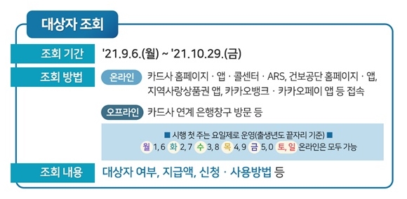 ๊ตญ๋ฏผ์ง์๊ธ ๋์ ์กฐํ๋ 9์ 6์ผ ์ค์ 9์๋ถํฐ ์นด๋์ฌ ํํ์ด์ง๋ ์ฑ, ๊ทธ๋ฆฌ๊ณ ๊ฑด๊ฐ๋ณดํ๊ณต๋จ ํํ์ด์ง์์ ํ์ธํ ์ ์์ต๋๋ค.