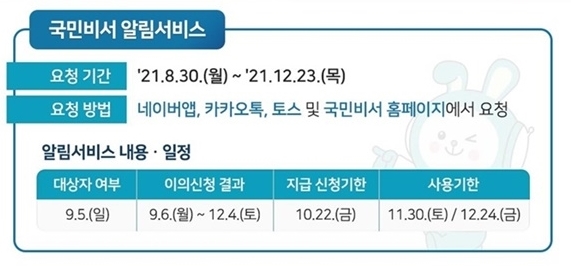 ๊ตญ๋ฏผ์ง์๊ธ ๋์ํ์ธ์ "๊ตญ๋ฏผ๋น์ ์ฌ์ ์๋ฆผ์๋น์ค" ์ด์ฉํ๊ธฐ : 8์ 30์ผ๋ถํฐ ์ ์ฒญ๋ฐ๊ณ ์๋ค์.