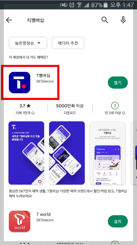 sk λΈλ‘λλ°΄λλ₯Ό μ΄μ©νκ³ κ³μ λ€λ©΄ νλμ΄ μ€ν μ΄μμ 'Tλ©€λ²μ½' κ²μν ν μ±μ λ€μ΄λ‘λ λ°μ μ€μΉνμΈμ.