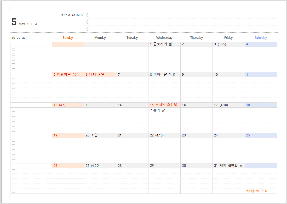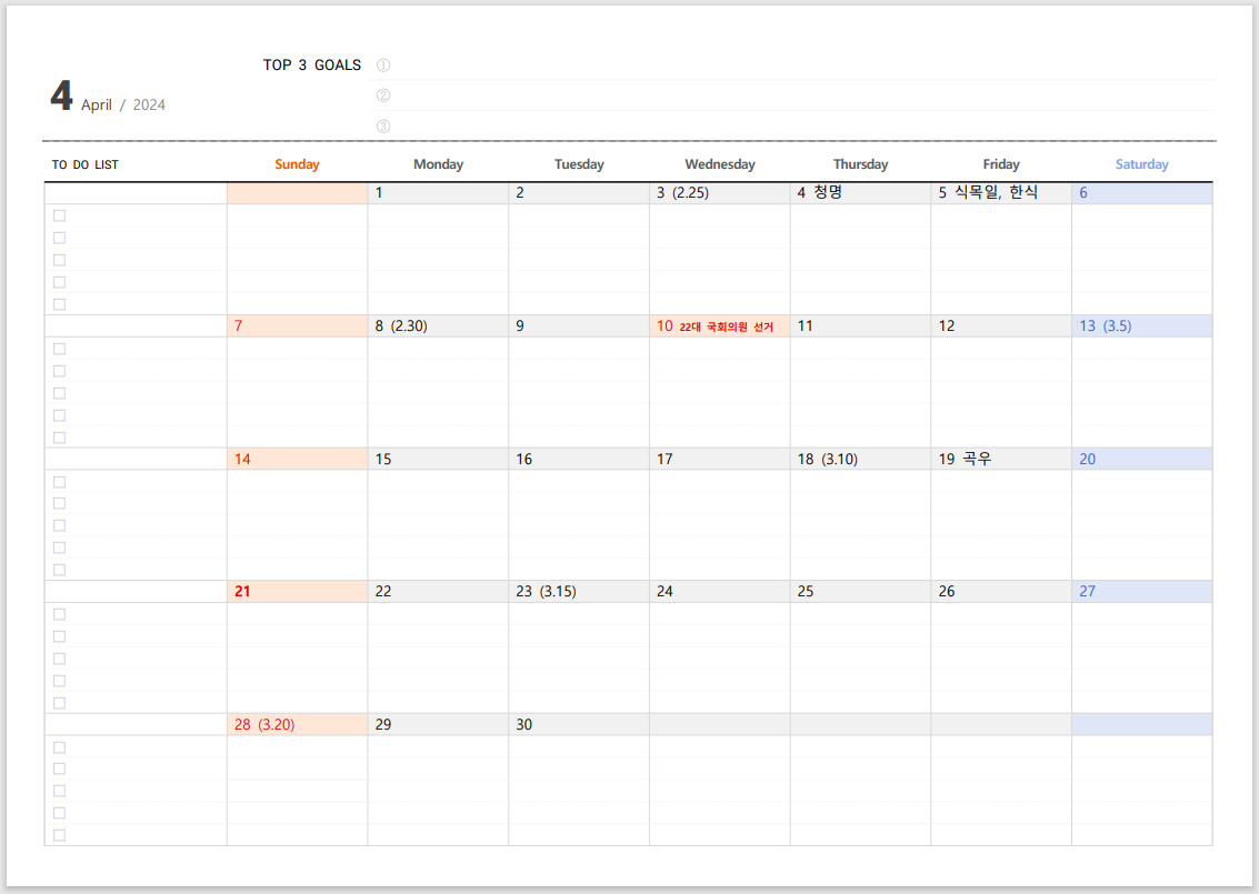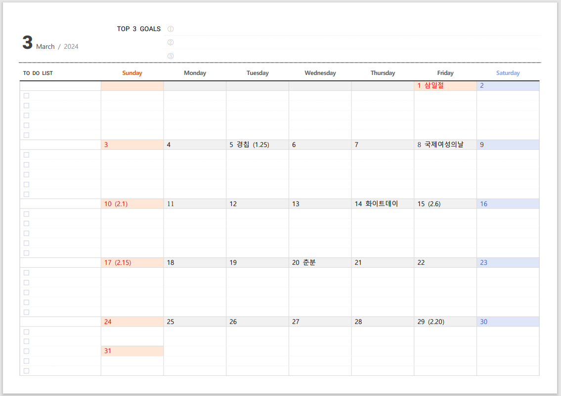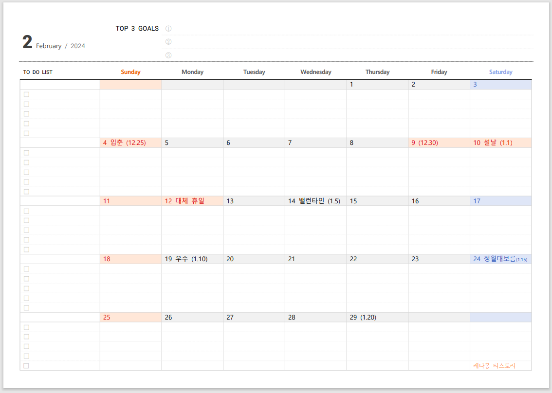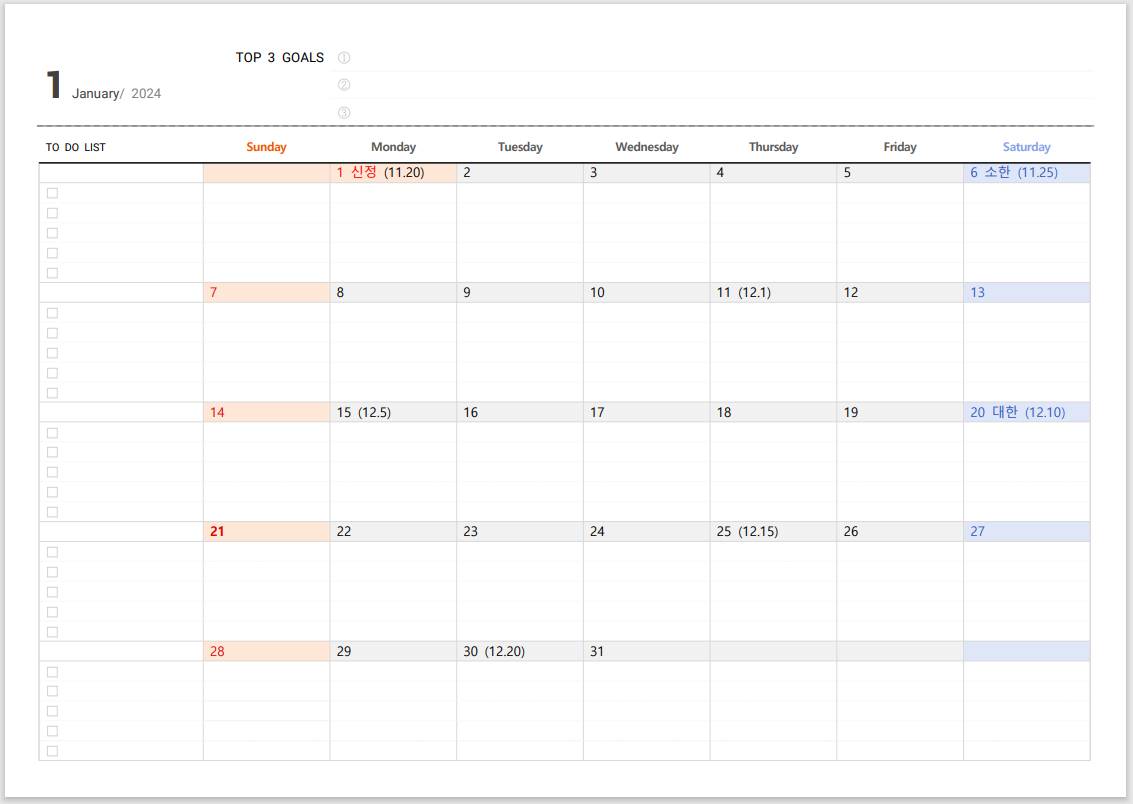 2024λ 1μ λ¬λ ₯μ λλ€. μ°μ 2024λ λ¬λ ₯ λͺ©ννμ μλ¨μ λͺ©ν 3κ°μ§λ₯Ό μΈ μ μκ² λμ΄ μμ΅λλ€. κ·Έλ¦¬κ³ μΌμͺ½μλ μ£Όκ° ν΄μΌν μΌμ μ μ΄λμ μ μλλ‘ λμ΄ μμ΅λλ€. ν΄μΌν μΌμ μ κ²ν μ μλ 체ν¬λλ μμ΅λλ€.