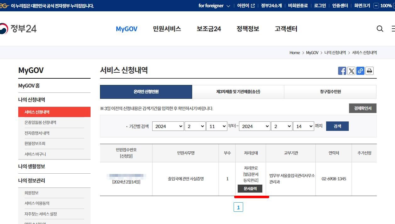 7. ์๋น์ค ์ ์ฒญ๋ด์ญ์ ๋ฐ๋ก ๋ฐ๊ธ๋ ๊ฒ์ ํ์ธํ ์ ์์ต๋๋ค. ๋ฌธ์์ถ๋ ฅ์ ํด๋ฆญํ์ฌ ์ถ์ ๊ตญ์ฌ์ค์ฆ๋ช ์๋ฅผ ํ๋ฆฐํธํ๋ฉด ๋ฉ๋๋ค.
