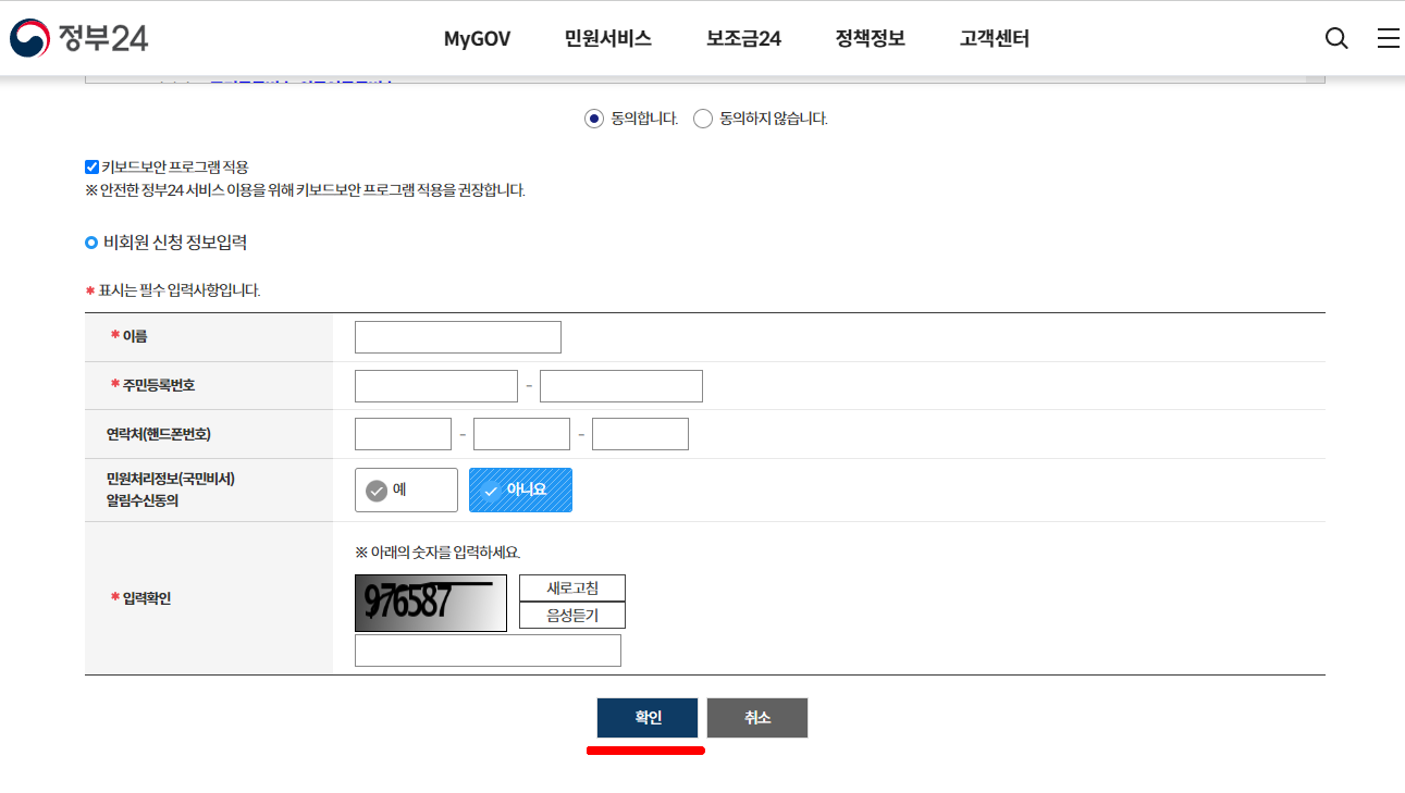 3. ์ด๋ฆ๊ณผ ์ฃผ๋ฏผ๋ฑ๋ก๋ฒํธ๋ฅผ ์ฐ๊ณ ํ์ธ์ ๋๋ฆ ๋๋ค.