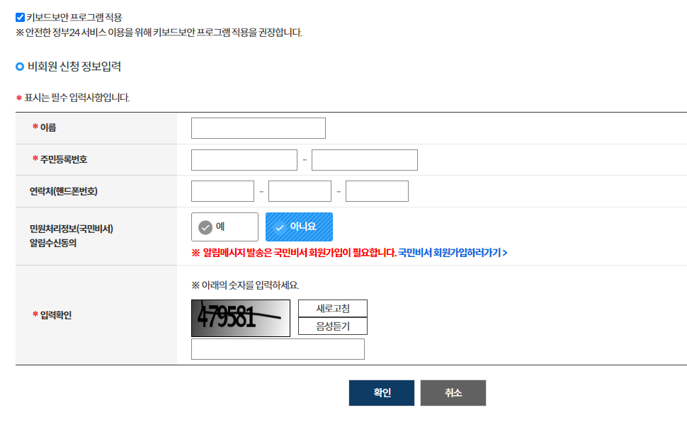 4. ํ์์ฌํญ ์ ์ฒญ ์ ๋ณด๋ฅผ ์ ๋ ฅ ํ ๋ณด์๋ฌธ์๋ฅผ ์ ๋ ฅํ๊ณ ํ์ธ์ ๋๋ฆ ๋๋ค.