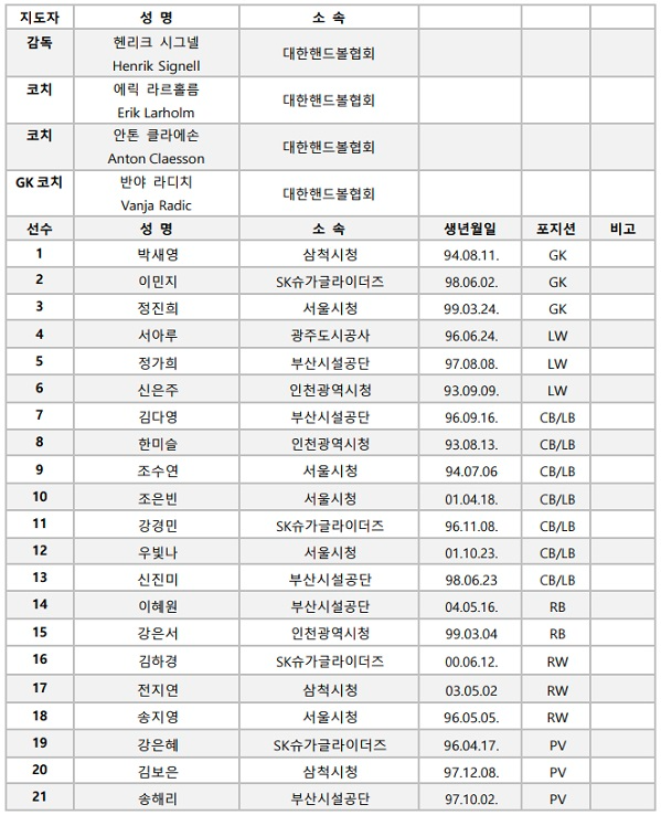 - GK (๊ณจํคํผ) : ๋ฐ์์ (์ผ์ฒ์์ฒญ), ์ด๋ฏผ์ง (SK ์๊ฐ๊ธ๋ผ์ด๋์ฆ), ์ ์งํฌ (์์ธ์์ฒญ)