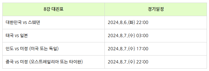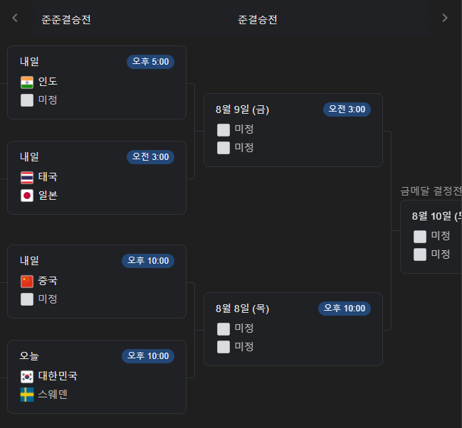 - 8์ 6์ผ (ํ) 22:00: ๋ํ๋ฏผ๊ตญ vs ์ค์จ๋ด