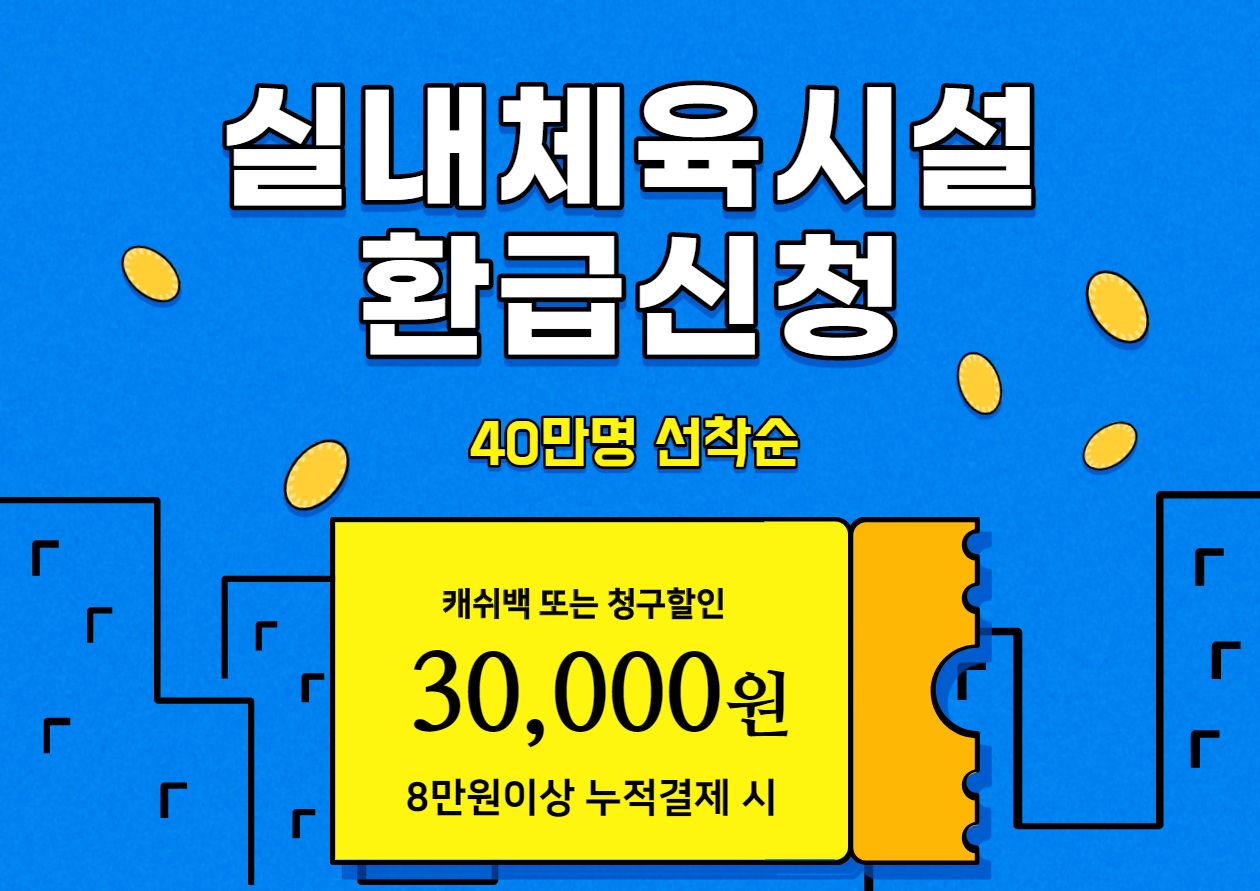 ์ค๋ด ์ฒด์ก์์ค ํ๊ธ ์ ์ฒญํ์ธ์. 8๋ง์ ๋์ ๊ฒฐ์ ์ 3๋ง์ ์บ์ฌ๋ฐฑ ๋๋ ์ฒญ๊ตฌํ ์ธ ์ด๋ฒคํธ ์์ด์.