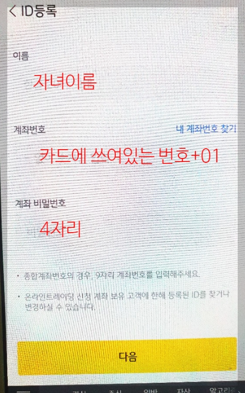 5) ๋ค์์ ๋ํ๋๋ ID๋ฑ๋ก ํ๋ฉด์์ ์๋ ์ด๋ฆ, ์ฆ๊ถ๊ณ์ข๋ฒํธ(์นด๋ ๋ท๋ฉด์ ์ฐ์ฌ์์ด์. ์ฐ์ฌ์๋ ์ฆ๊ถ๊ณ์ข ๋ท์๋ฆฌ์ 01์ ๋ํด์ ๋ฑ๋กํ์ธ์) ๊ทธ๋ฆฌ๊ณ ์ฆ๊ถ๊ณ์ข ๋น๋ฐ๋ฒํธ(4์๋ฆฌ)๋ฅผ ๋ฃ๊ณ ๋ค์์ ํด๋ฆญํฉ๋๋ค.