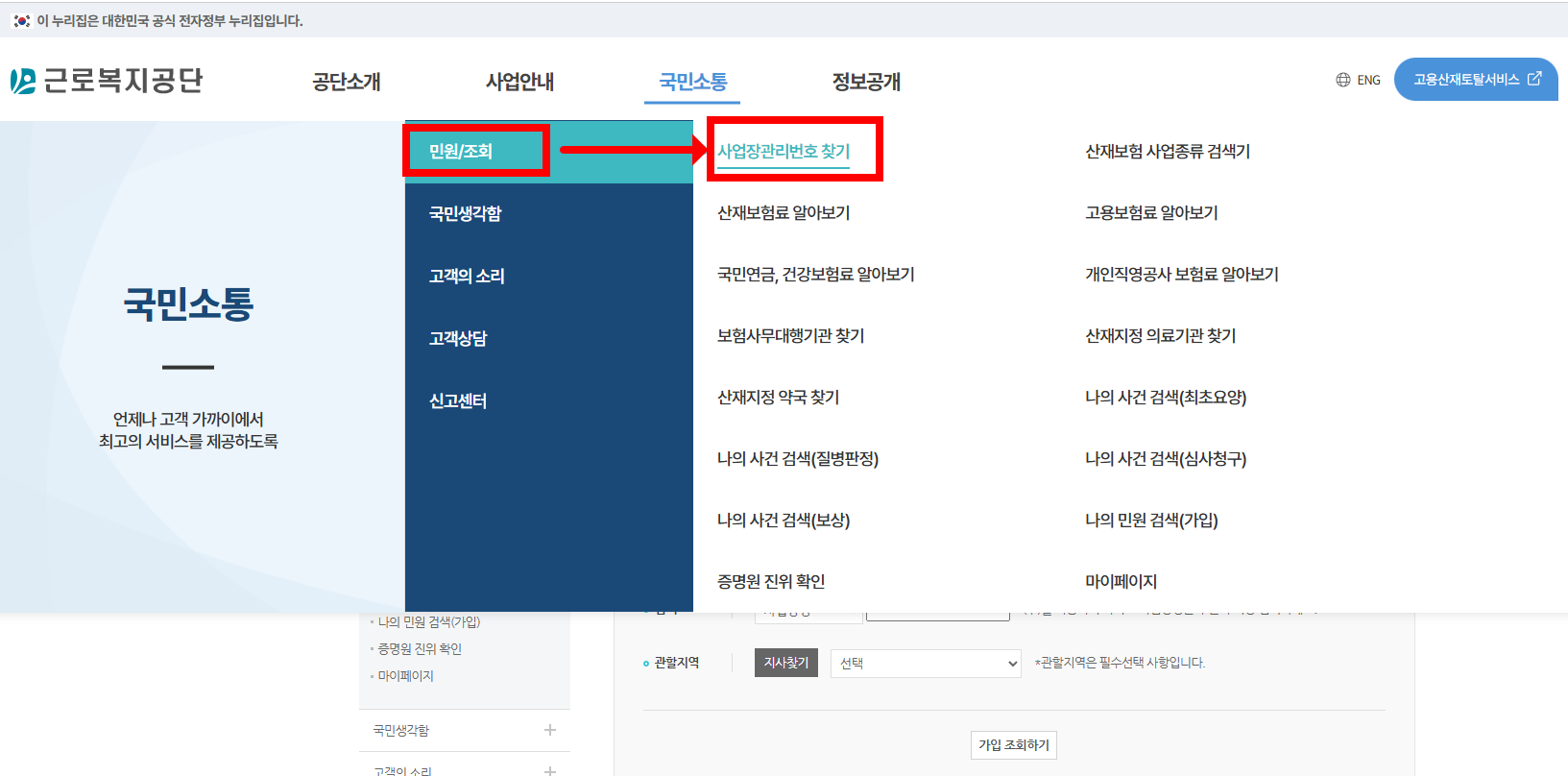 2๏ธโฃ ๋ฉ์ธ ๋ฉ๋ด → ๊ณ ๊ฐ์ํต → ์ฌ์ ์ฅ๊ด๋ฆฌ๋ฒํธ ์ฐพ๊ธฐ ํด๋ฆญ